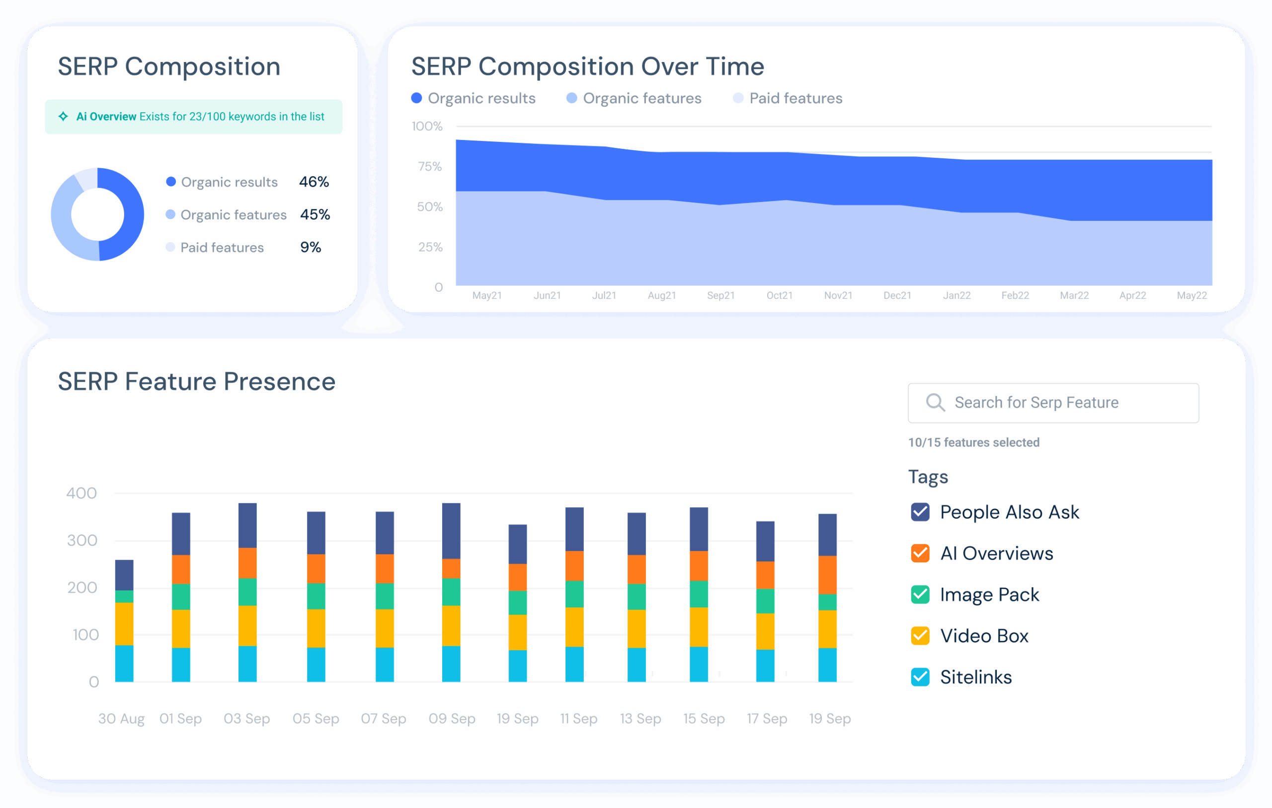 Filter keywords in your Rank Tracker based on the presence of AI Overviews. That way, you know which keywords feature organic results. And which ones push them down.