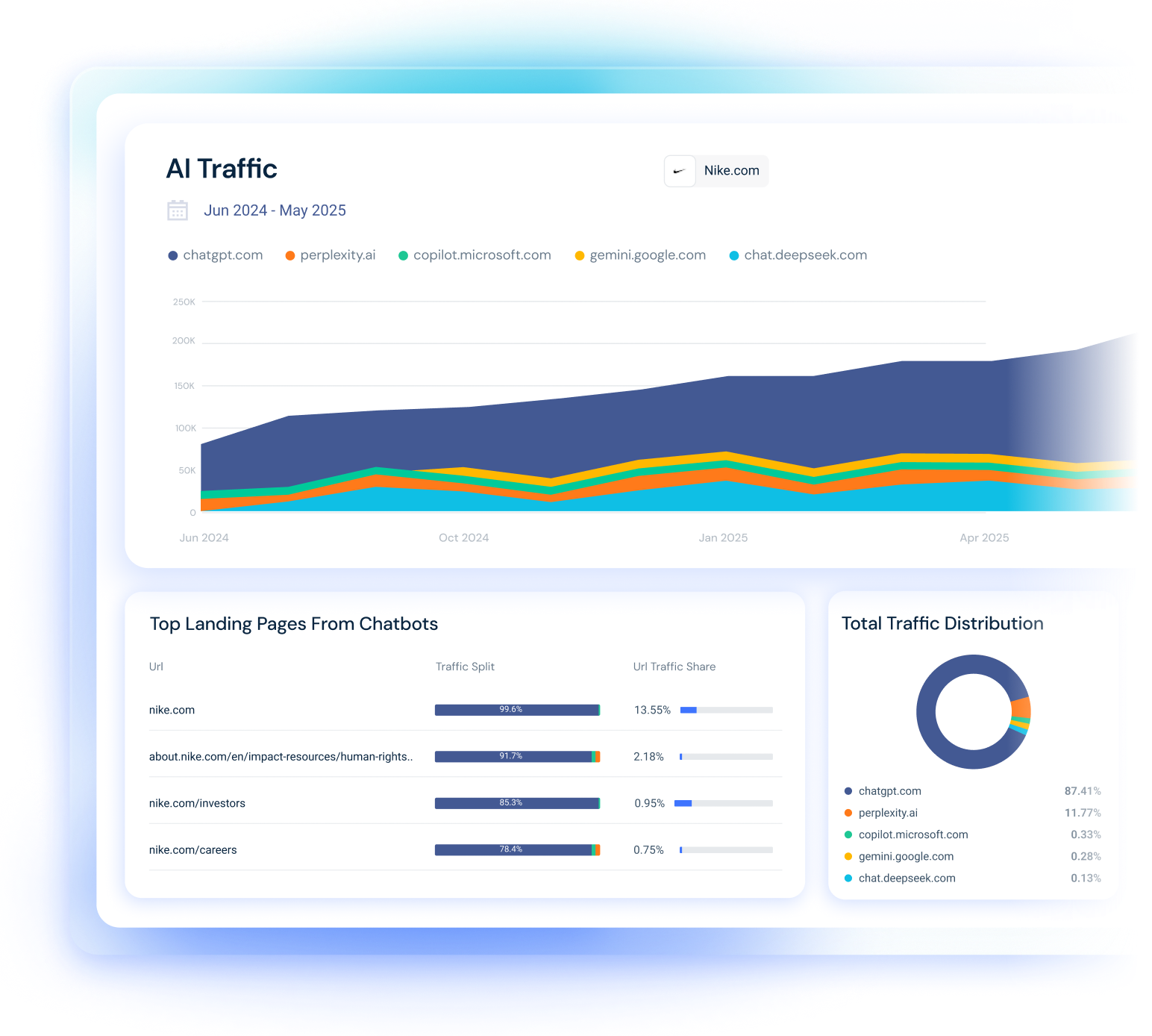 Access AI traffic metrics for any website. Get granular insights into both the landing pages winning traffic and the prompts that have driven the clicks.